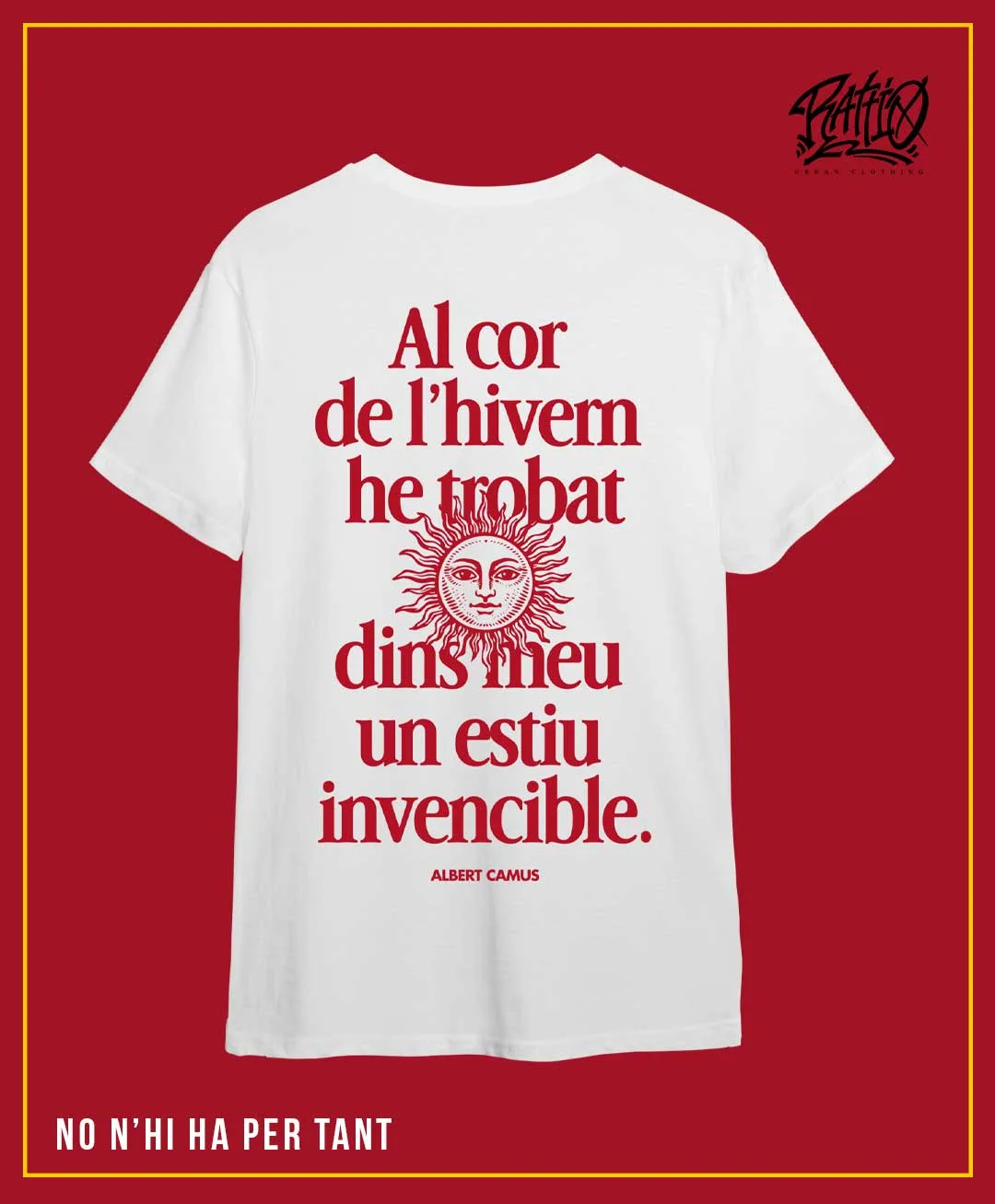Samarreta del podcast de Pau Llonch i Oriol Farrés “No n’hi ha per tant”, model amb la frase d’Albert Camus “Al cor de l’hivern he trobat dins meu un estiu invencible”.
