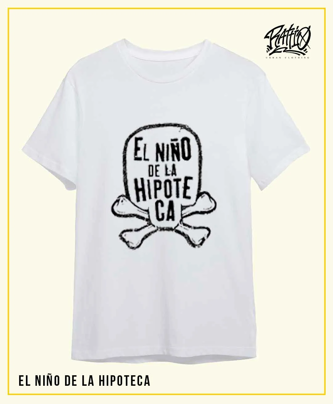Camiseta de manga corta blanca con el logo con diseño de calavera de «El Niño de la Hipoteca».