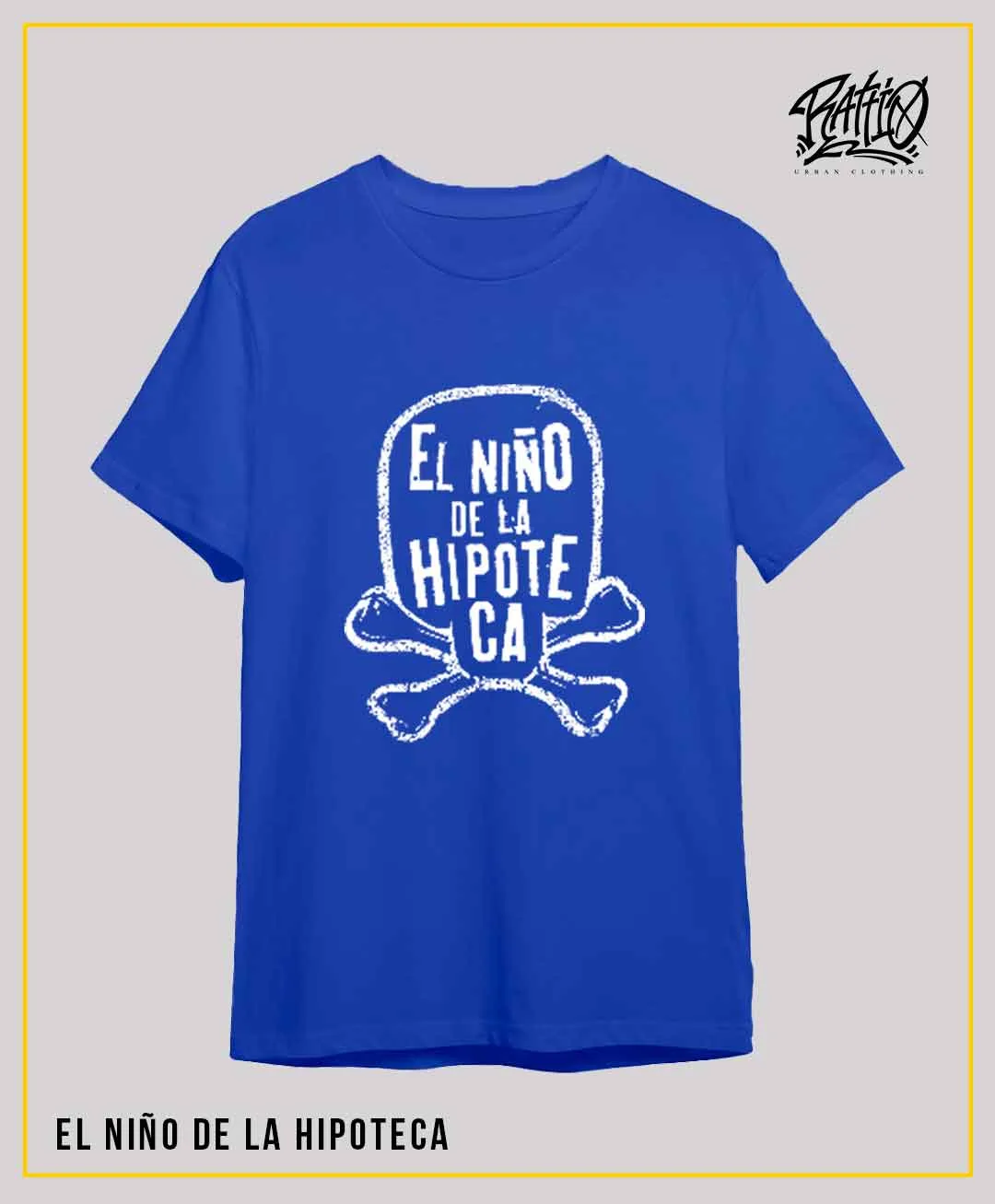 Camiseta de manga corta azul con el logo con diseño de calavera de «El Niño de la Hipoteca».