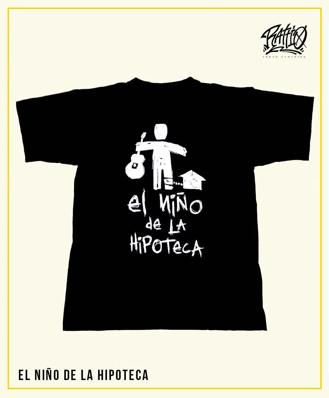 Camiseta de manga corta negra con el diseño de «El Niño de la Hipoteca» en la parte delantera.