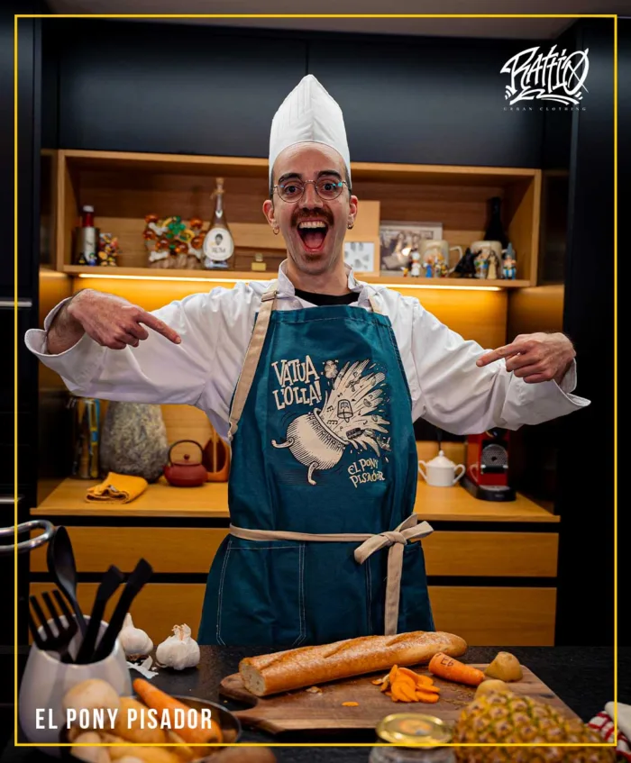 Davantal de cuina color cian fosc amb el disseny de «Vatua l’Olla», fet pel @fruitscesc, a la part de davant.