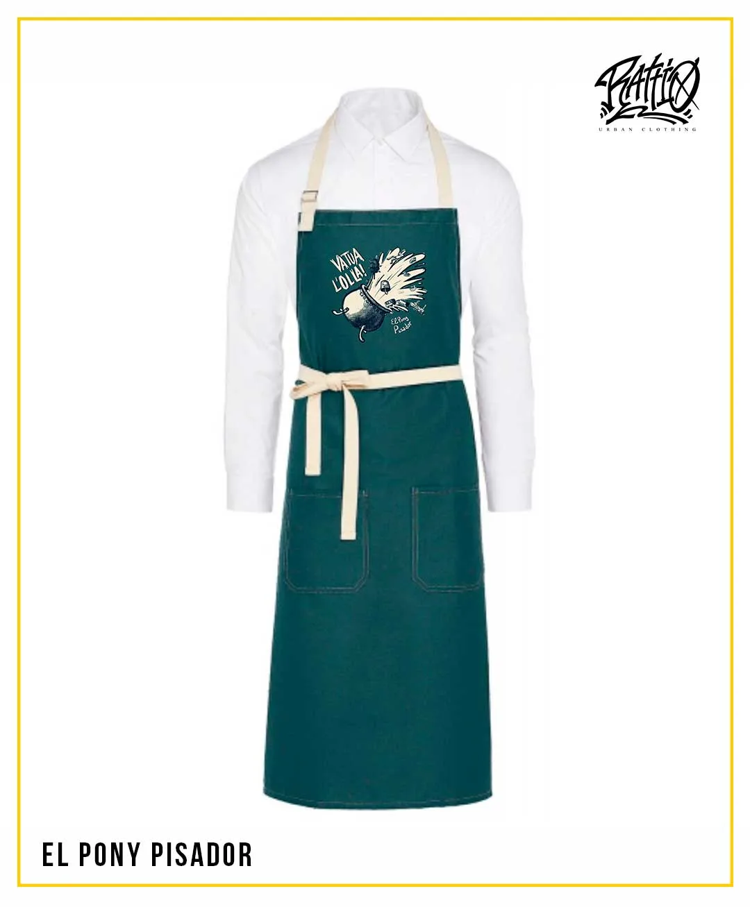Davantal de cuina color cian fosc amb el disseny de «Vatua l’Olla», fet pel @fruitcesc, a la part de davant.